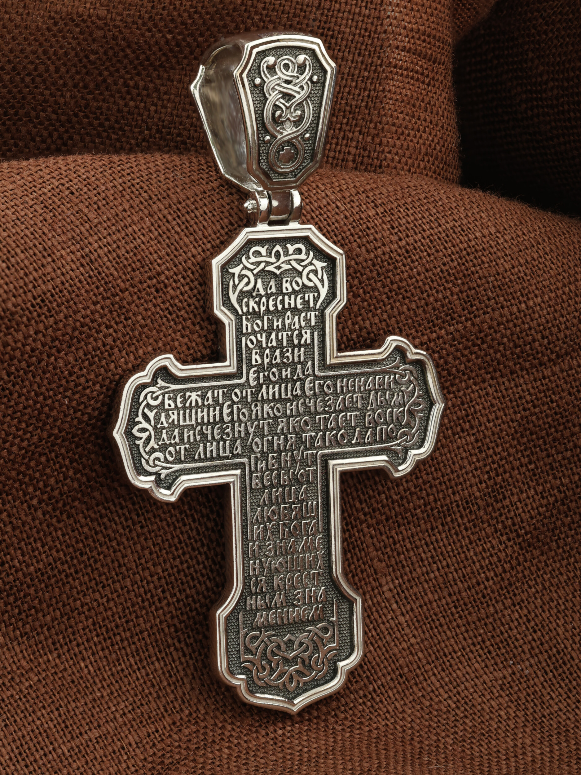 На оборотной стороне креста написана молитва Честному Кресту Господню: «Да воскреснет Бог, и расточатся врази Его, и да бежат от лица Его ненавидящии Его. Яко исчезает дым, да исчезнут; яко тает воск от лица огня, тако да погибнут беси от лица любящих Бога и знаменующихся крестным знамением…».