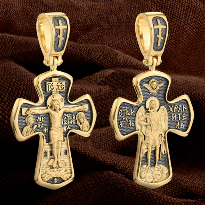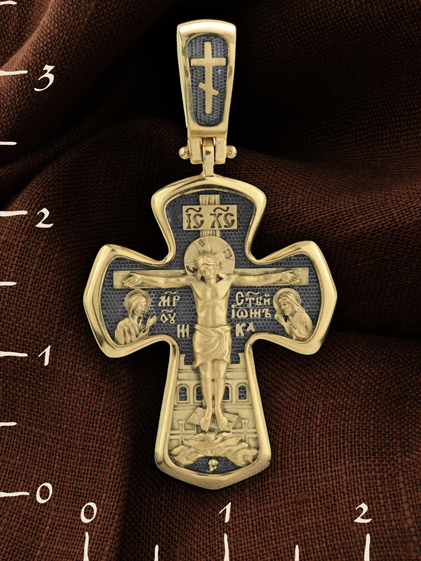 На лицевой стороне креста изображено Распятие Господа и Спасителя нашего Иисуса Христа, отдавшего Себя на смерть, для искупления грехов мира. Господь сказал: кто хочет идти за Мною, отвергнись себя, и возьми крест свой, и следуй за Мною. (Мк. 8: 34). Крест является символом жертвенной любви всеблагого Бога к падшим людям, всепобеждающим духовным оружием христиан, основанием и средоточием церковной жизни. На верхней перекладине помещена надпись «IС» « ХС», что означает Иисус Христос. Ниже — слово «НИКА», что означает «победитель». Слева от Распятия изображена Пресвятая Богородица, справа — апостол и евангелист Иоанн Богослов, один из ближайших учеников Иисуса Христа. За Распятием высится Иерусалимская стена, в знак того, что Господь был распят вне стен города. Возвышение, на котором стоит Крест, символизирует гору Голгофу, на которой произошло Распятие. Под подножием Креста изображена покоящаяся голова (череп) Адама. На кулонном кольце помещен крест.