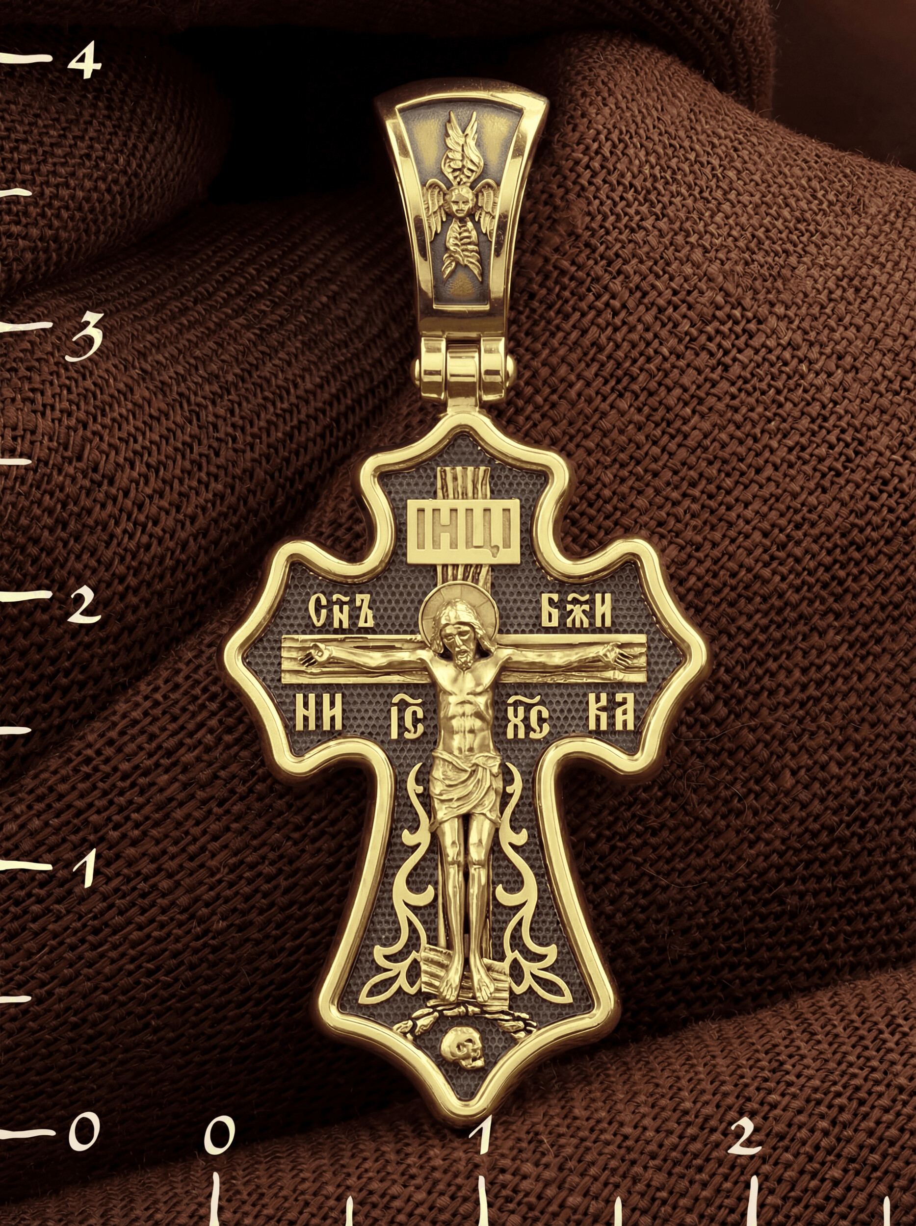 Основной композицией лицевой стороны является Распятие Господа Иисуса Христа. Позади Распятия видна иерусалимская стена, знак того, что Господь был распят вне стен города. Стена символизирует и Небесный Иерусалим, путь который открылся для человека через Голгофу. У подножья Господа в виде скалистой горки видна сама Голгофа с Главой Адамовой в пещере. Распятие сопровождается каноническими надписями. Это святое имя Христа, которое принято писать на иконах сокращенно — «ИС ХС», словосочетание «СЫН БОЖИЙ», что означает божественную природу Иисуса Христа, и надпись «НИКА» — «победитель». Над головой Господа на поперечной перекладине аббревиатура «IНЦI», что символизирует табличку, которая была прибита к Кресту, с надписью «Иисус Назорей Царь Иудейский».