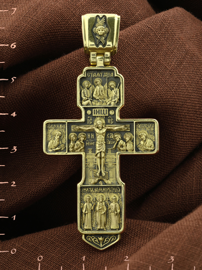 В центре лицевой стороны изображена фигура Спасителя на восьмиконечном кресте, на фоне Иерусалимской стены. Ему предстоят скорбящие Богородица, Иоанн Богослов, Мария Магдалина и сотник Лонгин. Над крестом — солнце и луна. Крест стоит на горе камней, символизирующих Голгофу, в основании которой различается череп. Это голова Адама. Распятие сопровождается каноническими надписями. Над Распятием в оглавии изображен образ Пресвятой Троицы. Это образ Триединого Бога явившегося в виде трех Ангелов праотцу Аврааму. Ангелы сидят за трапезным столом вокруг чаши, которая символизирует грядущую жертву Второго Лица Пресвятой Троицы, Бога Сына.