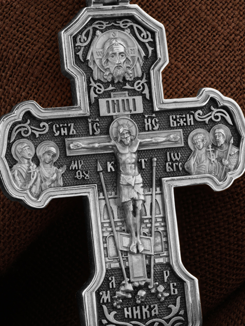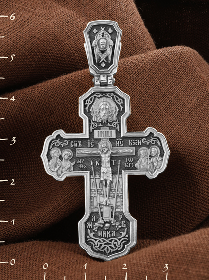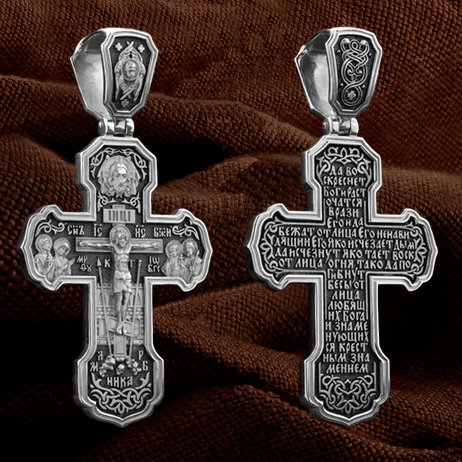 На лицевой стороне креста изображено Распятие Господа и Спасителя нашего Иисуса Христа. Крест- символ спасения и искупления рода человеческого, знамение победы над смертью и адом. Иисус Христос, как искупительная жертва освобождения человечества от власти греха, умер крестной смертью и в третий день воскрес. На верхней табличке, выше головы Иисуса, расположена надпись, составленная Понтием Пилатом — «IНЦI». Она означает «Иисус Назорей, Царь Иудейский». Надпись «IС» « ХС» означает Иисус Христос и помещается на разных сторонах поперечной (большой) перекладины креста. Рядом расположена надпись «Сын Божий». Выше Распятия изображен Нерукотворный образ Господа и Спасителя нашего Иисуса Христа. Слева от Распятия — Пресвятая Богородица и святая мироносица Мария Магдалина с крестом в руке. Справа — апостол и евангелист Иоанн Богослов, один из ближайших учеников Иисуса Христа и сотник Лонгин с крестом в правой руке и копьем — в левой. За крестом высится Иерусалимская стена. Крест стоит на горе камней, символизирующих Голгофу. В ее основании различается череп — это голова Адама. Вдоль креста изображены копие сотника Лонгина и трость с губкой и буквы «К» и «Т». Надпись «МЛРБ» — «место лобное рай бысть» означает, что место лобное стало раем и помещаются в нижней части креста. Рядом — слово «НИКА», что означает «победитель». На православном кресте Христос не умирает, а свободно простирает руки, ладони Иисуса открыты, будто он хочет обнять все человечество, даря им свою любовь и открывая путь к вечной жизни. На кулонном кольце изображен шестикрылый Серафим.