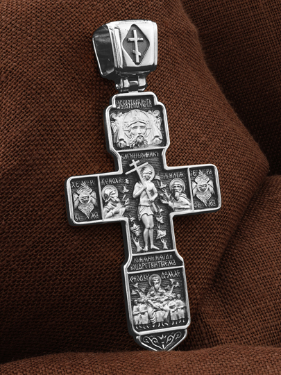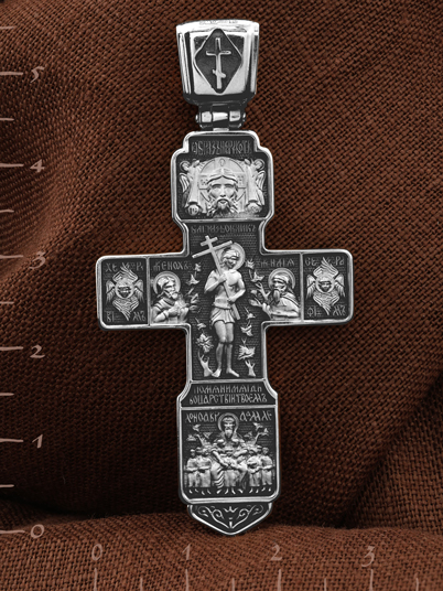 На концах горизонтальной балки креста помещены образы вселенских святителей и творцов литургии Василия Великого и Иоанна Златоуста. В кулонном кольце изображены райские врата с их стражем — Херувимом. Врата, которые открылись благодаря крестной жертве Христа.