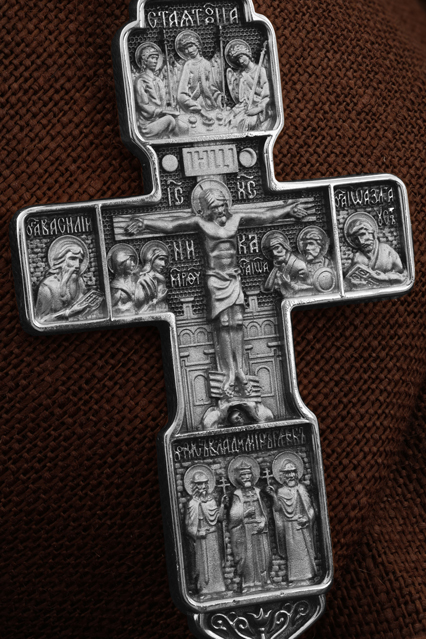 В нижней части креста изображены образы первых русских святых князей-мучеников — Бориса (князь ростовский) и Глеба (князь муромский) и святого равноапостольного князя Владимира. Страстотерпцам Борису и Глебу молятся об умиротворении Отечества, о добром нраве властей и правителей, о сохранении от междоусобицы, о даровании мужества перед лицом смертельной опасности. С Борисом и Глебом неразрывно связан образ их отца — святого равноапостольного князя Владимира, который также почитается как защитник и покровитель Русской Земли и Церкви. В молитвах его называют «отец русский» или «отец всея Руси».