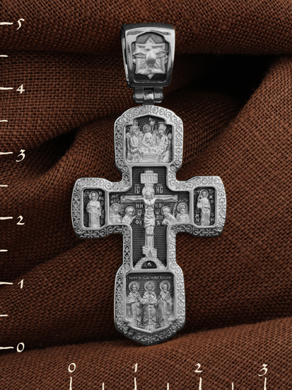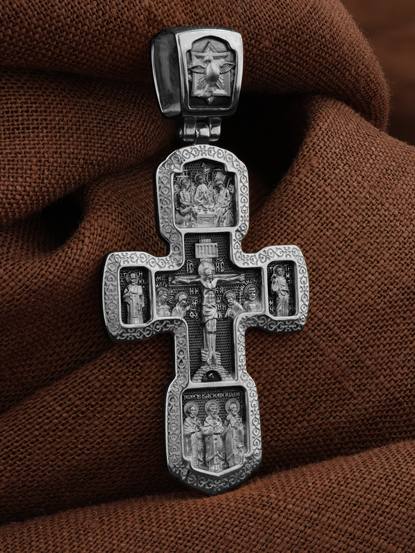 Центральную часть лицевой стороны занимает Распятие Господа Иисуса Христа с предстоящими Ему святыми, которые, по преданию, находились у Креста Господа во время Его казни. Слева — Пресвятая Богородица и жены-мироносицы — равноапостольная Мария Магдалина и святая Мария Клеопова, справа — праведный Иосиф Аримофейский и мученик Лонгин Сотник. Над Распятием помещена икона Святой Троицы. Ангелы сидят за трапезным столом вокруг чаши, которая символизирует грядущую жертву Второго Лица Пресвятой Троицы, Бога Сына. Слева от Господа находится святой Николая Чудотворец, справа — святой мученик.