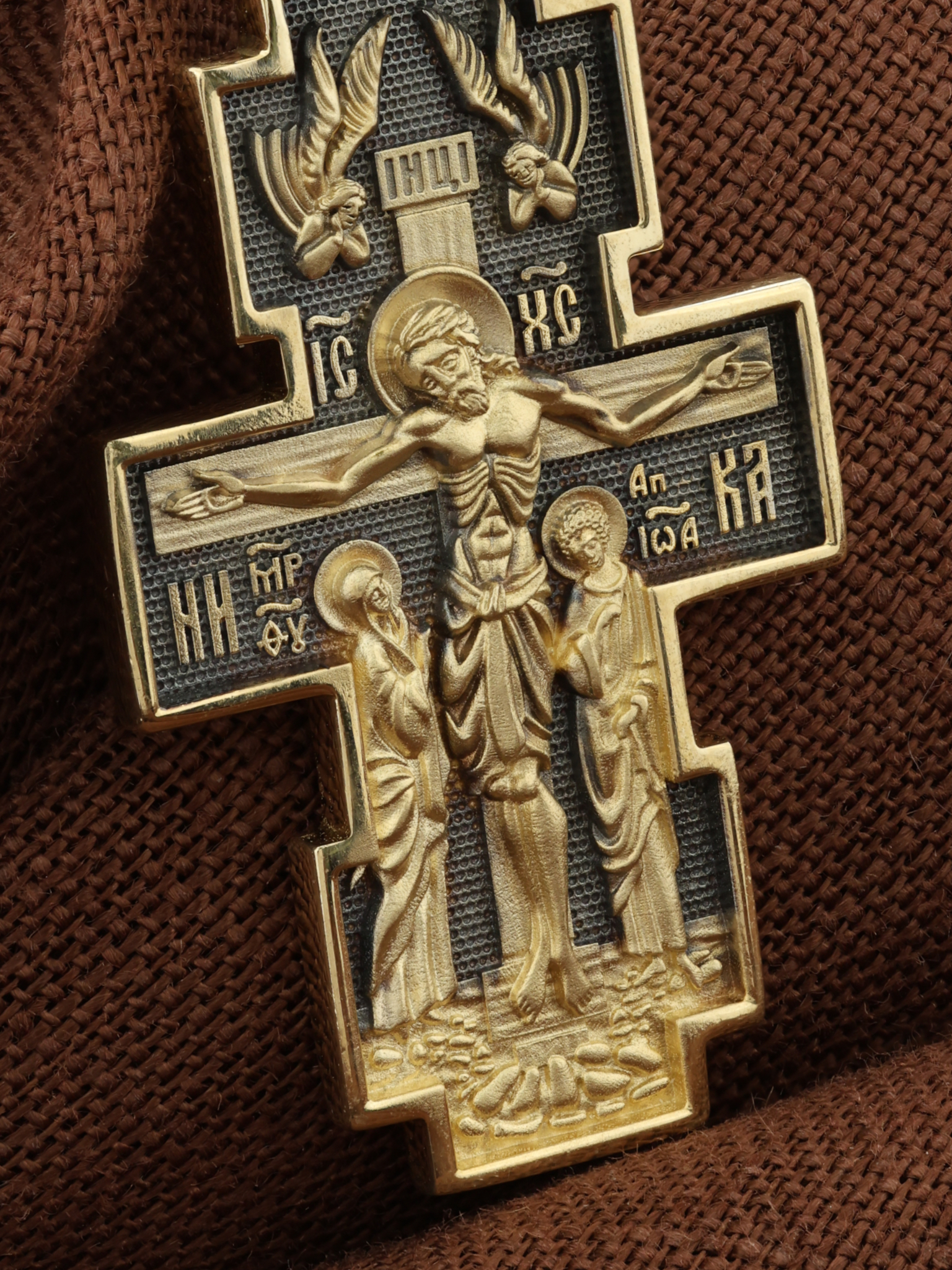 На лицевой стороне креста изображено Распятие Христово — величественный, торжественный образ христианства, знак победы над смертью. Христос, принеся Себя в Жертву на Кресте, искупил грехи всего мира и дал людям возможность обрести спасение. Слева и справа от Креста стоят Богоматерь и апостол Иоанн Богослов. По преданию, именно они до последнего не оставляли Спасителя в Его страданиях, были с Ним до самой смерти. Во главе образка изображен парящий голубь — символ Святого Духа и Его благодати. Сверху над Распятием парят Ангелы. Они изображены летящими с Небес вниз, к Кресту. Ангелы словно поддерживают табличку над головой Спасителя, на которой написано IНЦИ — «Иисус Назарянин Царь Иудейский». Эта табличка — титло — была приколочена римскими палачами как указание на «вину» Христа, то, за что Он был казнен.