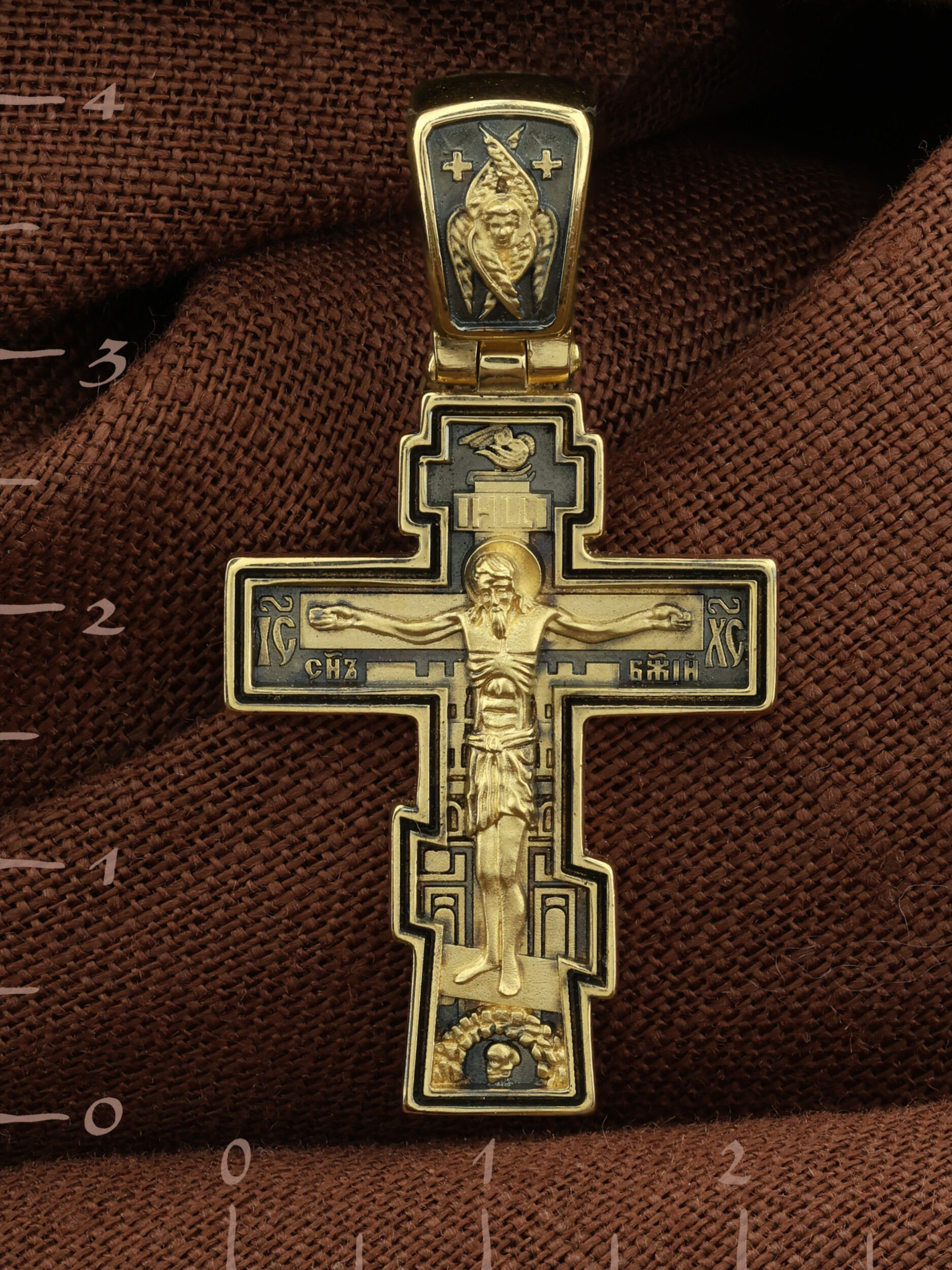 Восьмиконечный нательный крест с Распятием Иисуса Христа на горе Голгофе. Форма этого кресты является одной из самых распространенных на Руси и более всего соответствует тому Кресту, на котором был распят Христос.