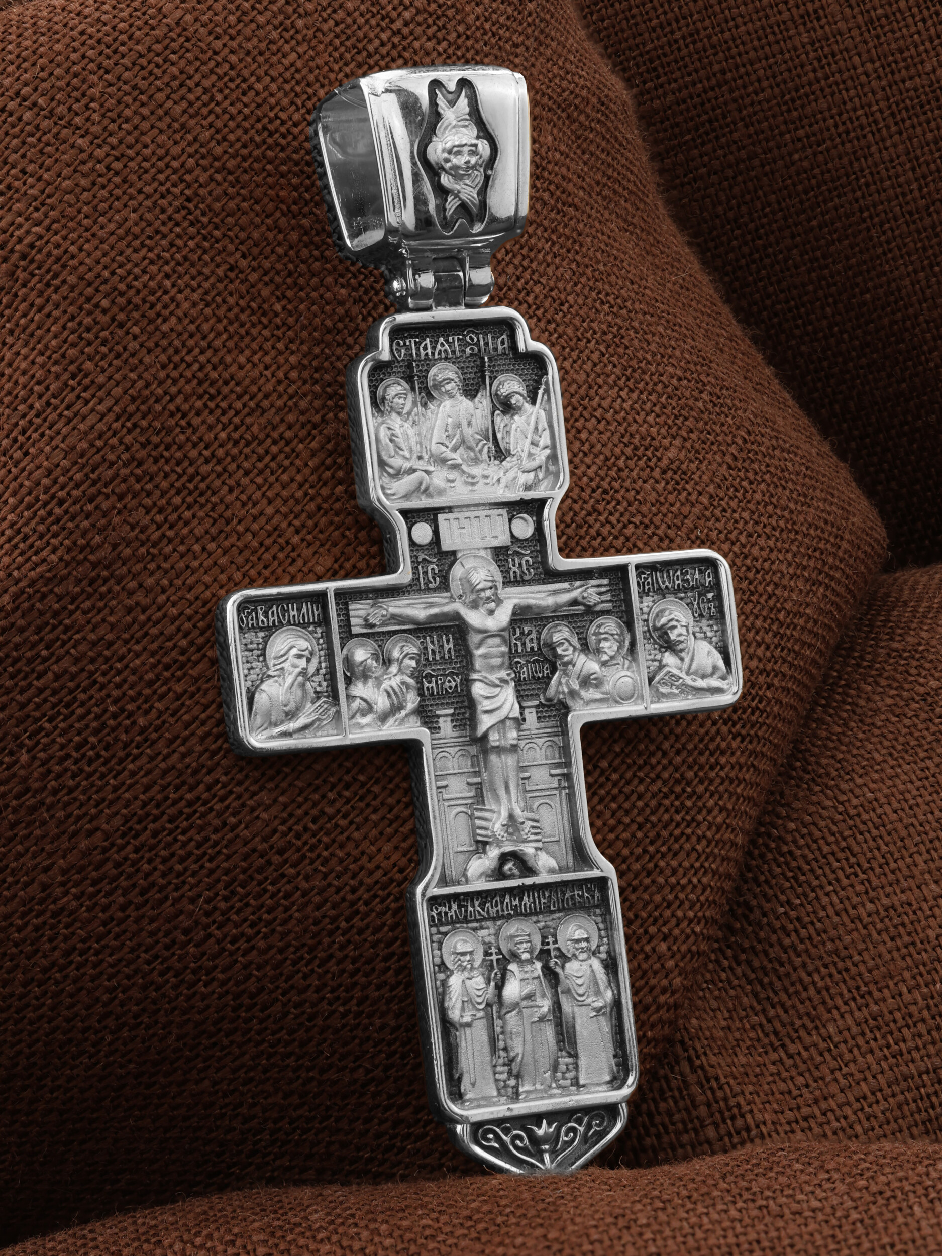 В центре лицевой стороны изображена фигура Спасителя на восьмиконечном кресте, на фоне Иерусалимской стены. Ему предстоят скорбящие Богородица, Иоанн Богослов, Мария Магдалина и сотник Лонгин. Над крестом — солнце и луна. Крест стоит на горе камней, символизирующих Голгофу, в основании которой различается череп. Это голова Адама. Распятие сопровождается каноническими надписями. Над Распятием в оглавии изображен образ Пресвятой Троицы. Это образ Триединого Бога явившегося в виде трех Ангелов праотцу Аврааму. Ангелы сидят за трапезным столом вокруг чаши, которая символизирует грядущую жертву Второго Лица Пресвятой Троицы, Бога Сына.