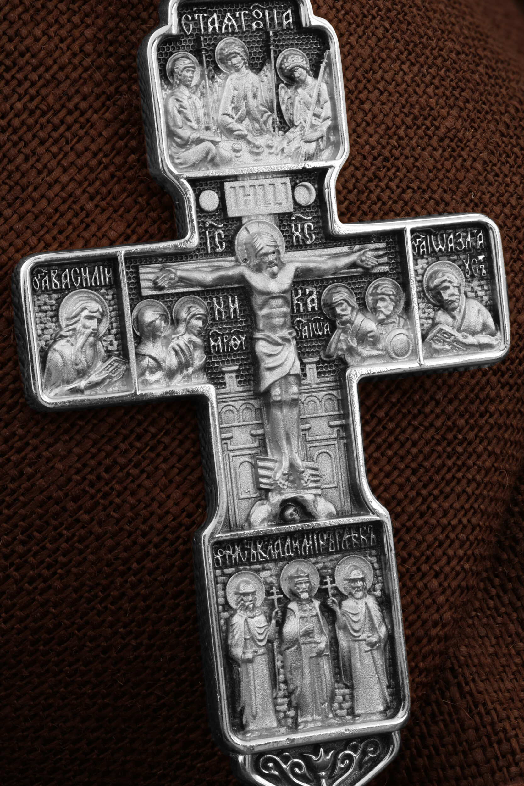 В нижней части креста изображены образы первых русских святых князей-мучеников — Бориса (князь ростовский) и Глеба (князь муромский) и святого равноапостольного князя Владимира. Страстотерпцам Борису и Глебу молятся об умиротворении Отечества, о добром нраве властей и правителей, о сохранении от междоусобицы, о даровании мужества перед лицом смертельной опасности. С Борисом и Глебом неразрывно связан образ их отца — святого равноапостольного князя Владимира, который также почитается как защитник и покровитель Русской Земли и Церкви. В молитвах его называют «отец русский» или «отец всея Руси».