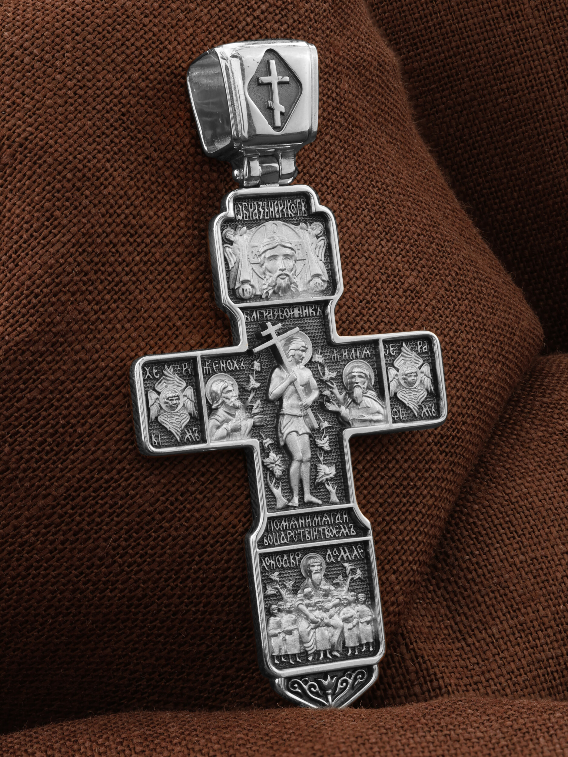 На концах горизонтальной балки креста помещены образы вселенских святителей и творцов литургии Василия Великого и Иоанна Златоуста. В кулонном кольце изображены райские врата с их стражем — Херувимом. Врата, которые открылись благодаря крестной жертве Христа.