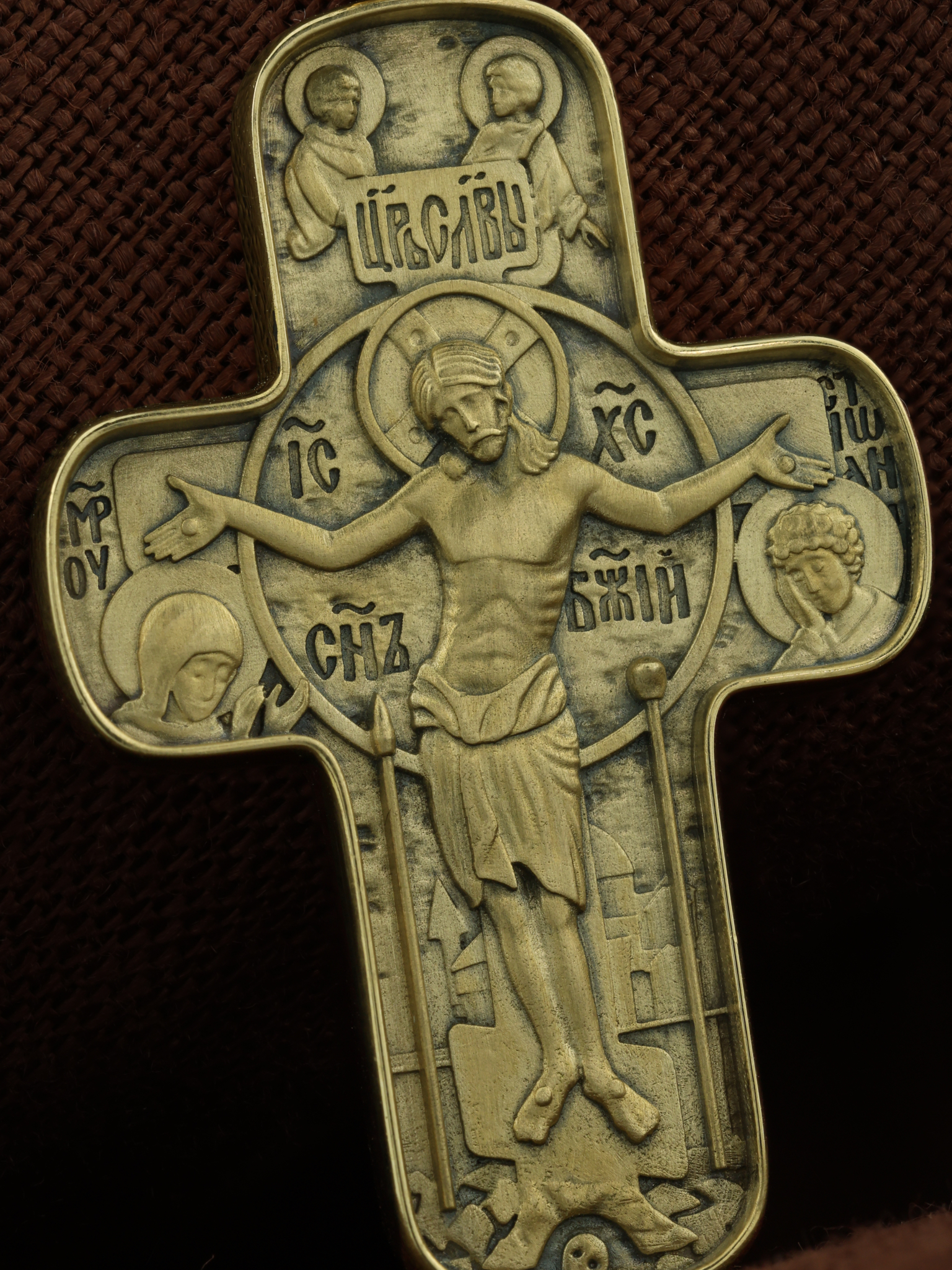 На лицевой стороне креста изображено Распятие Господа и Спасителя нашего Иисуса Христа. Христос, подвергнутый на кресте мучительной казни, своими страданиями искупил нас от древнего греха и даровал нам жизнь вечную. Без Распятия не было бы Воскресения Христова, и поэтому Крест из орудия казни обратился в святыню, в которой действует Благодать Божия. Над Распятием помещена надпись «Царь Славы». Распятие сопровождается надписями, олицетворяющими Христа: «IС» « ХС», что означает Иисус Христос и «Сын Божий». Над вершиной Распятия помещены изображения Ангелов.. Слева от Распятия изображена Пресвятая Богородица, справа — апостол и евангелист Иоанн Богослов, один из ближайших учеников Иисуса Христа. Возвышение, на котором стоит Крест, символизирует гору Голгофу, на которой произошло Распятие. Под подножием Креста изображена покоящаяся голова (череп) Адама