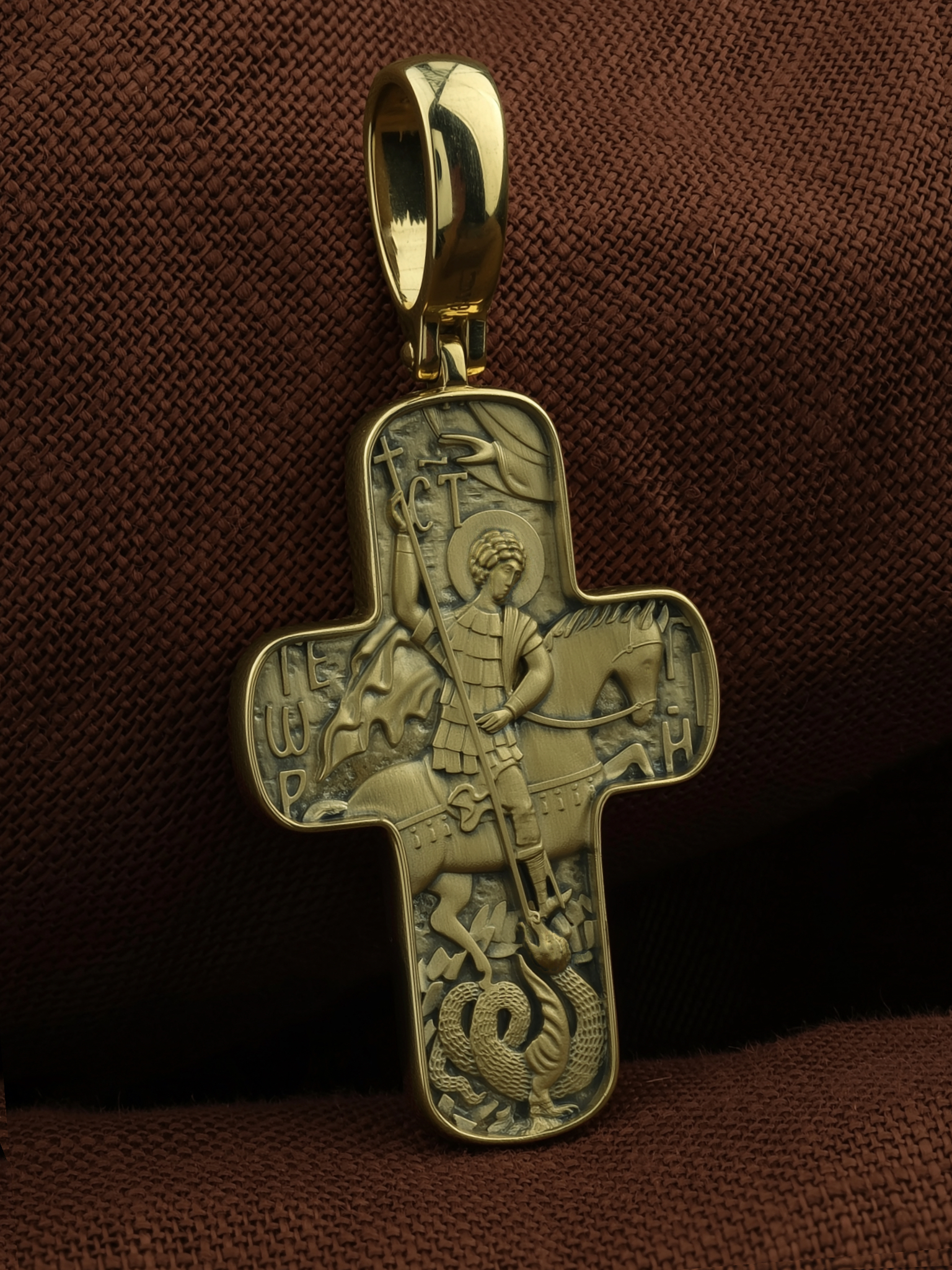 Основой композиции оборотной стороны креста является изображение Святого Великомученика Георгия Победоносца — одного из самых почитаемых и удивительных святых. На Руси он известен как Юрий или Егорий, покровитель воинов, помощник в крестьянском труде. На образке он изображен как воитель, сидящий на коне и поражающий копьем огнедышащего змея. Змей символизирует собою сатанинские силы. Молитвами вознесенными к Всевышнему и своей непреклонной верой он смог одолеть чудовище.. Над образом изображена благословляющая Божия десница.