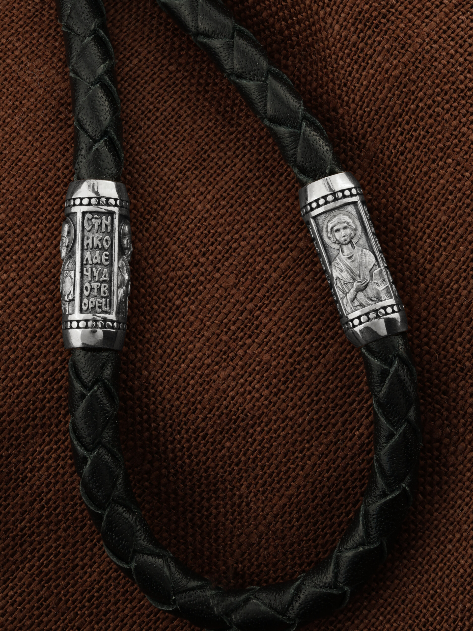Гайтан из белого золота c кожаным шнурком и ониксом