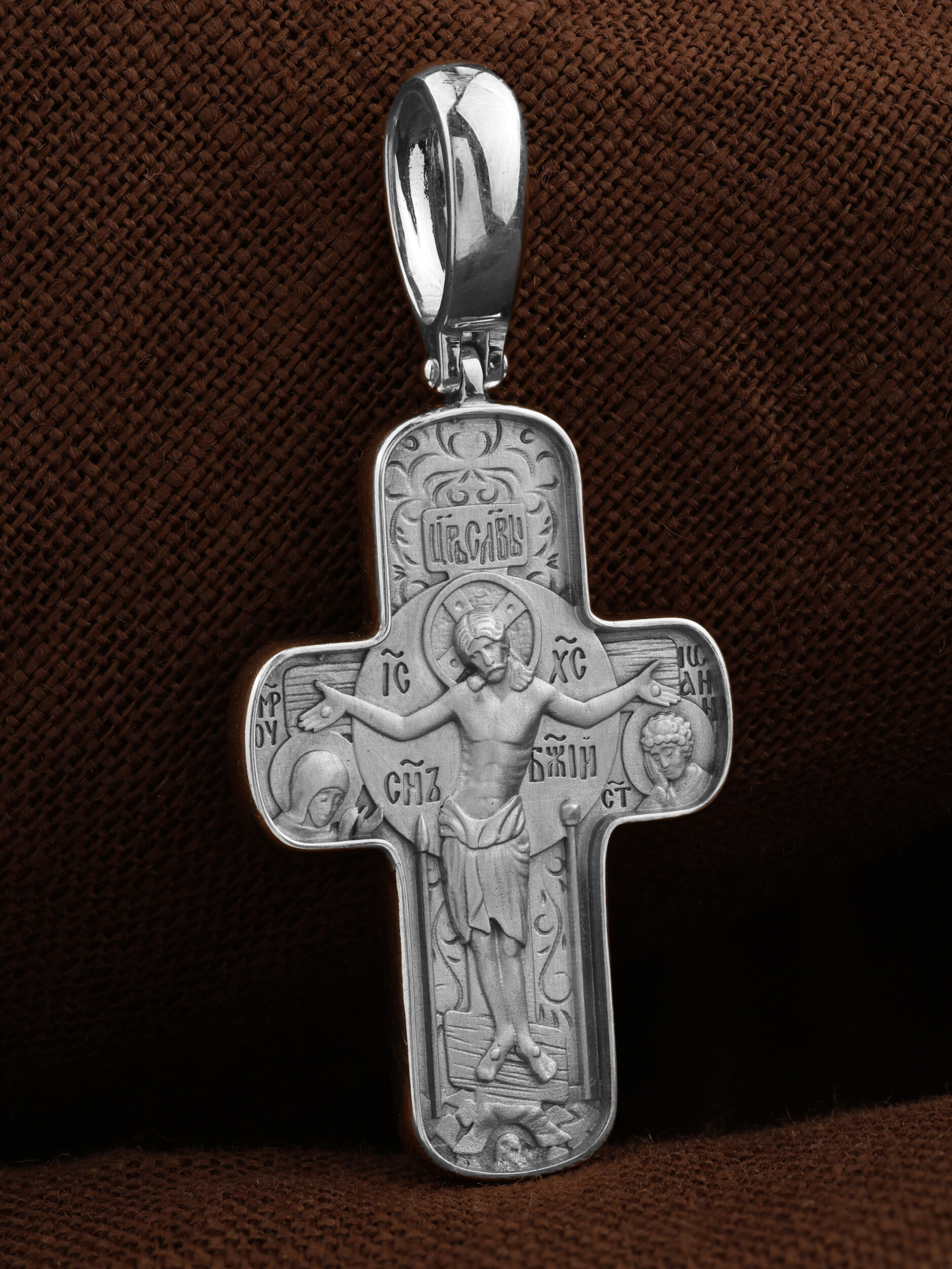 На лицевой стороне креста изображено Распятие Господа и Спасителя нашего Иисуса Христа. Крест- символ спасения и искупления рода человеческого, знамение победы над смертью и адом. Иисус Христос, как искупительная жертва освобождения человечества от власти греха, умер крестной смертью и в третий день воскрес. Над вершиной Распятия помещена надпись «Царь Славы». Надпись «IС» « ХС» означает Иисус Христос и помещается на разных сторонах поперечной перекладины креста. Рядом расположена надпись «Сын Божий». Слева от Распятия изображена Пресвятая Богородица, справа — апостол и евангелист Иоанн Богослов, один из ближайших учеников Иисуса Христа. Крест стоит на горе камней, символизирующих Голгофу. В ее основании различается череп — это голова Адама. Вдоль креста изображены копие сотника Лонгина и трость с губкой. На православном кресте Христос не умирает, а свободно простирает руки, ладони Иисуса открыты, будто он хочет обнять все человечество, даря им свою любовь и открывая путь к вечной жизни.