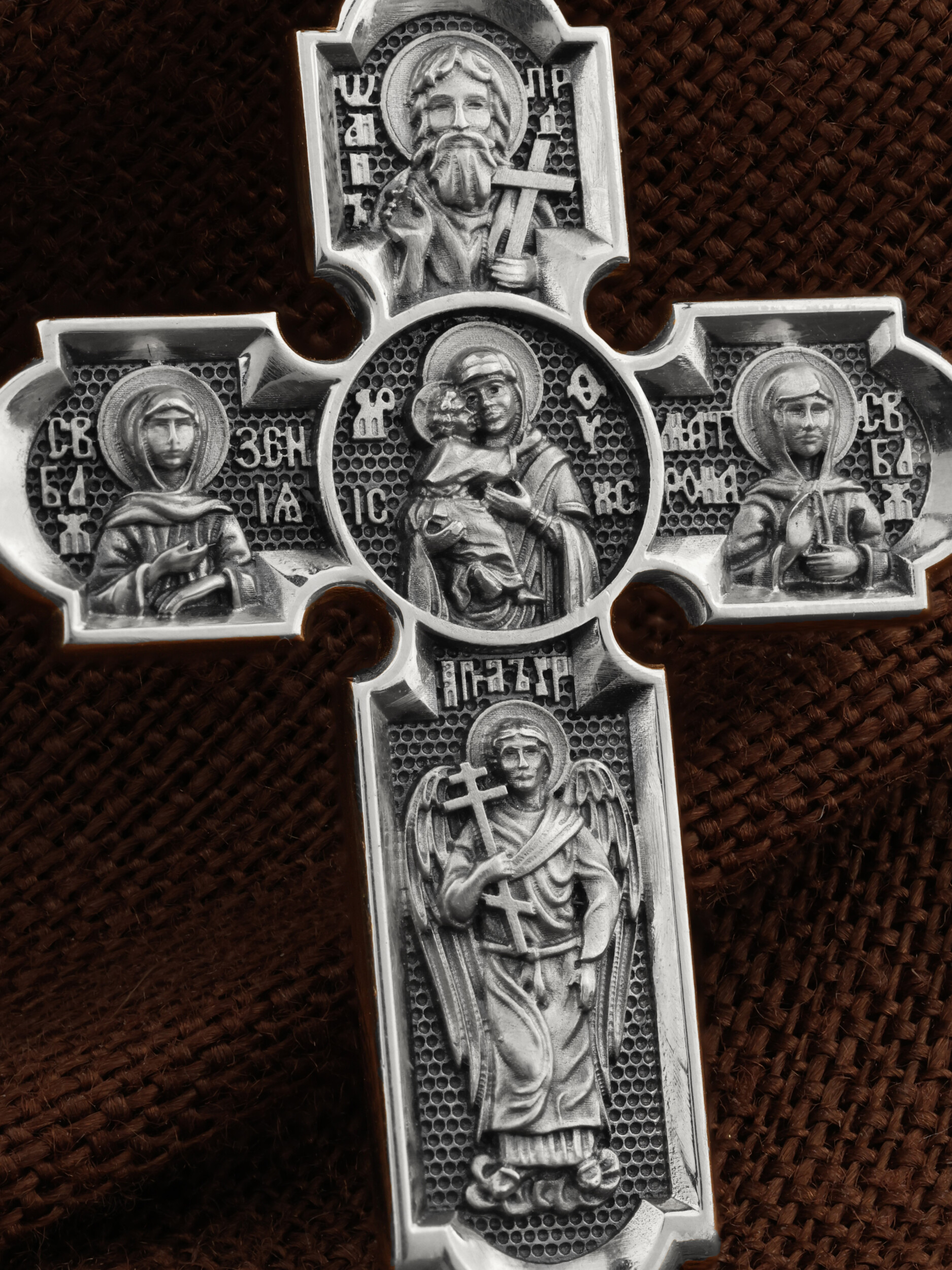 Центральную часть оборота креста украшает Владимирская икона Божией Матери. По преданию, она была написана на доске трапезного стола из дома Иисуса Христа. На Русь икона была привезена в начале XII века и с тех пор почитается как главная святыня нашего Отечества. Внизу изображен Архангел Михаил, слева — Святая Блаженная Ксения, справа — Святая Блаженная Матрона, вверху — пророк, почитающийся в христианстве, Предтеча Господень Иоанн Креститель. На кулонном кольце изображен Спас Нерукотворный — Символ вочеловечившегося Божества.