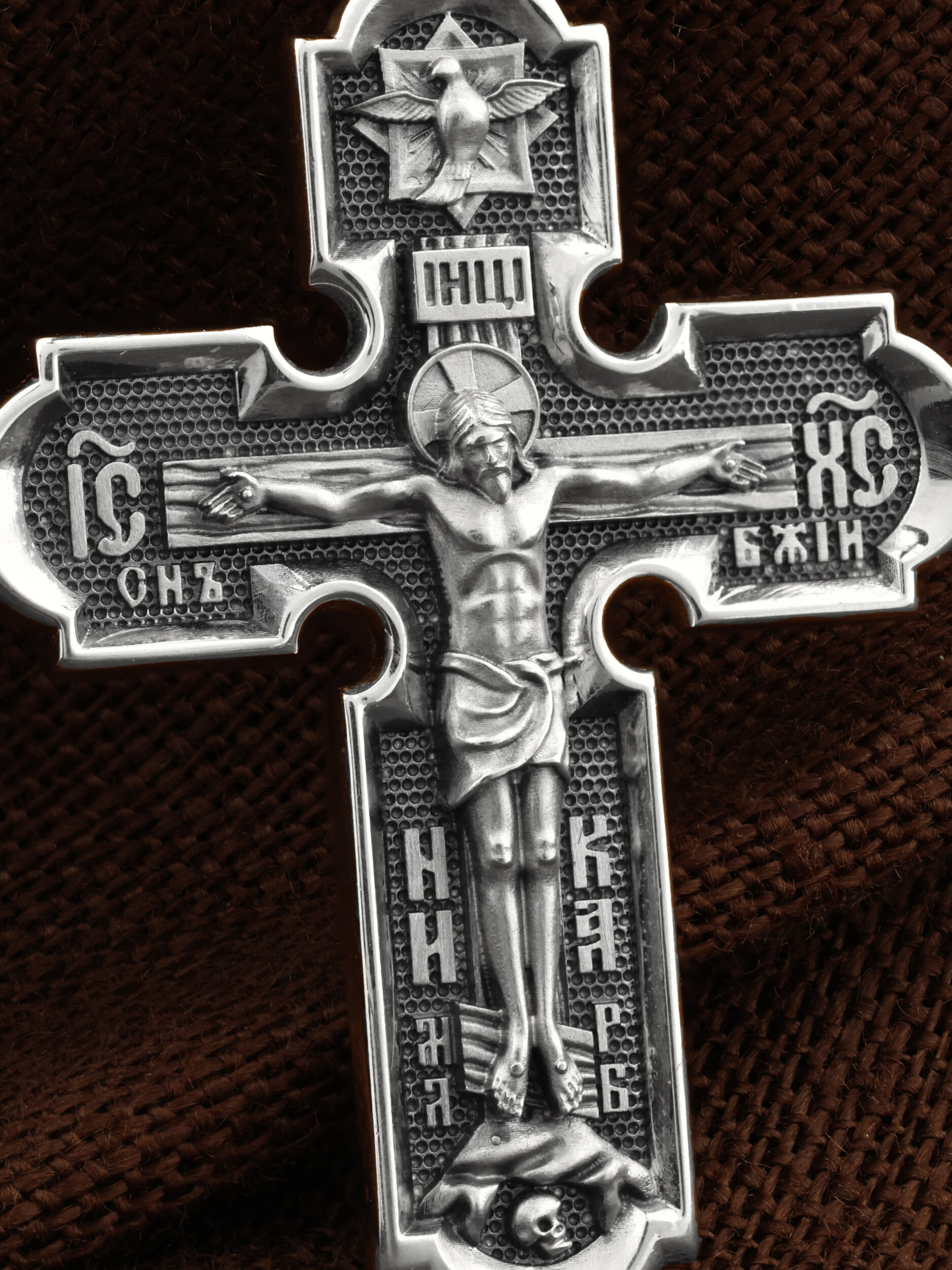 На лицевой стороне креста изображено Распятие Иисуса Христа. Господь представлен свободно покоящимся на кресте с простертыми руками и как бы обнимающим всю Вселенную. Верхняя перекладина символизирует титло — табличку, на которой, согласно Евангелию, было начертано: Иисус Назорей Царь Иудейский (IНЦI). Также Распятие сопровождается надписями, олицетворяющими Христа: святое имя Христа «IC» (Иисус) «ХС» (Христос), и словосочетание «СНЪ БЖIЙ» — СЫН БОЖИЙ. Рядом с образом Христа помещены слова — «НИКА» (греч. — Победитель) и четыре буквы «МЛ» «РБ» — Место Лобное Рай Бысть. Возвышение, на котором стоит Крест, символизирует гору Голгофу, на которой произошло Распятие. У подножия Креста изображают прах Адама, обозначенный черепом. На кулонном кольце изображен шестикрылый Серафим — самый приближенный к Господу Ангел.